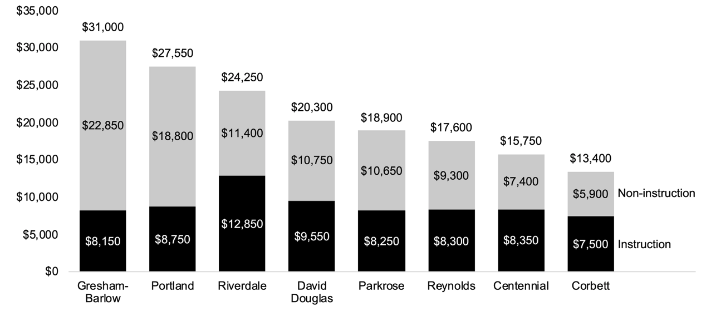 Funds for Oregon schools come from a complex mix of state, local, and federal sources. On average, school districts receive about $10,500 per student from the State School Fund. The figure below shows that districts in Multnomah County spend about $8,600 per student in instruction, which accounts for about half (or less) of total public school spending. If students aren’t getting instruction from their public schools, they should get that money back to receive instruction elsewhere. Imagine what families could do with $8,600 a year to spend on educational expenses.