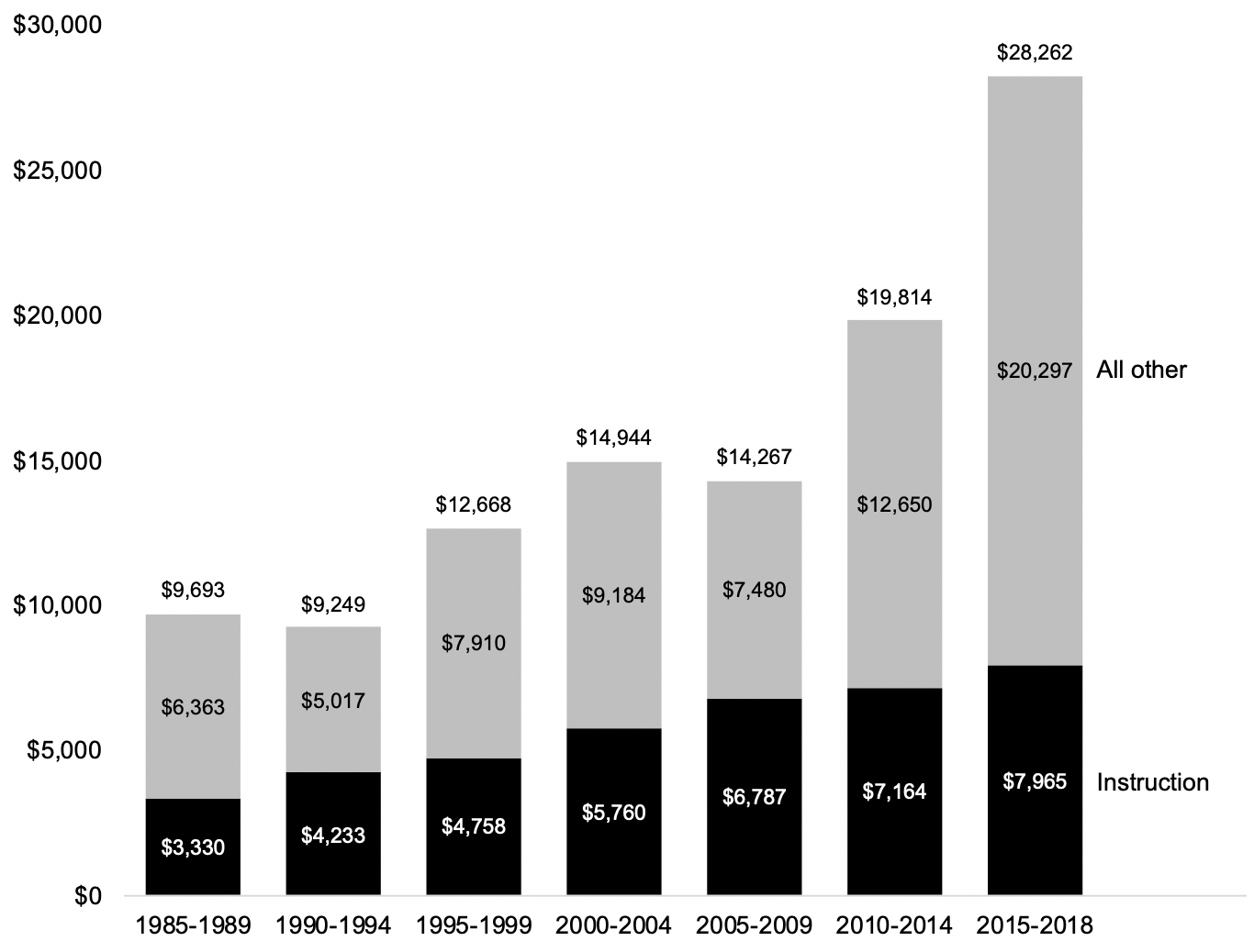 Over the past three decades, both total spending and spending on instruction at PPS have grown faster than the rate of inflation. In recent years, Portland schools have spent about $30,000 per student, with almost $8,000 per student spent on instruction.