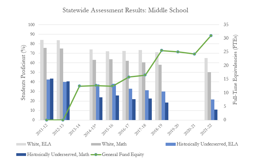 These supposed remedies for the achievement gap also appear disconnected from statistical reality. In middle schools, as General Fund Equity payments increase with the district’s budget, test scores for “historically underserved” students continue to lag about 40% behind white students in English Language Arts (ELA) and math. This is especially true for PPS’s “focus” schools in the inner city. Meanwhile, test scores for all students continue to decline.