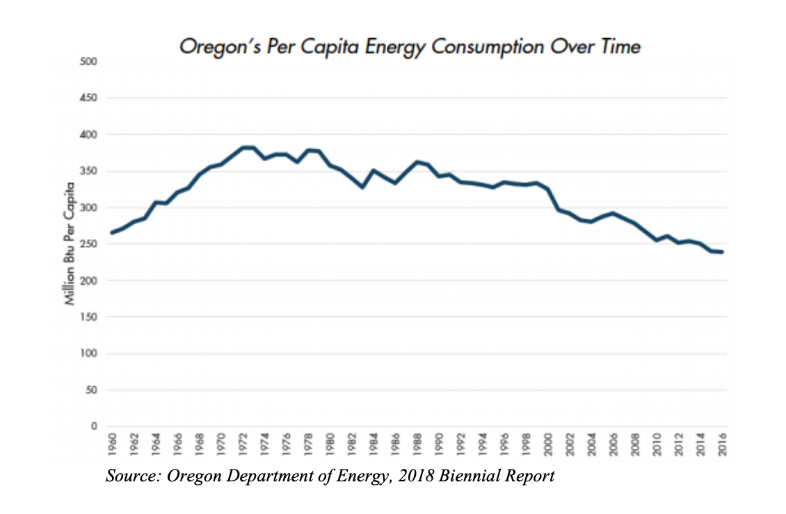 In fact, Oregon has improved its energy efficiency so much that per capita energy use in 2016 was the lowest it’s been since 1960, declining 37% since it peaked in 1972. Oregon has the lowest per capita energy use in the entire Northwest.