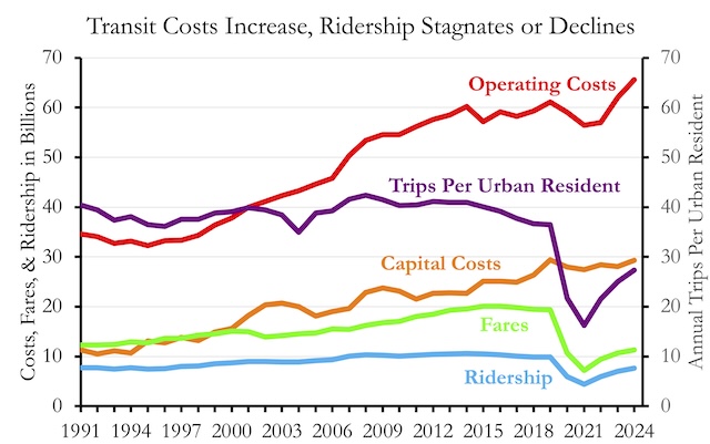 Caption: From 1965 (when Congress began subsidizing transit) to 2024, transit operating costs have increased 500 percent (after adjusting for inflation); fare revenues increased by 10 percent; ridership decreased by 10 percent; and trips per urban resident fell by 50 percent. (Source: National Transit Database Historic Time Series, 2024 edition.)